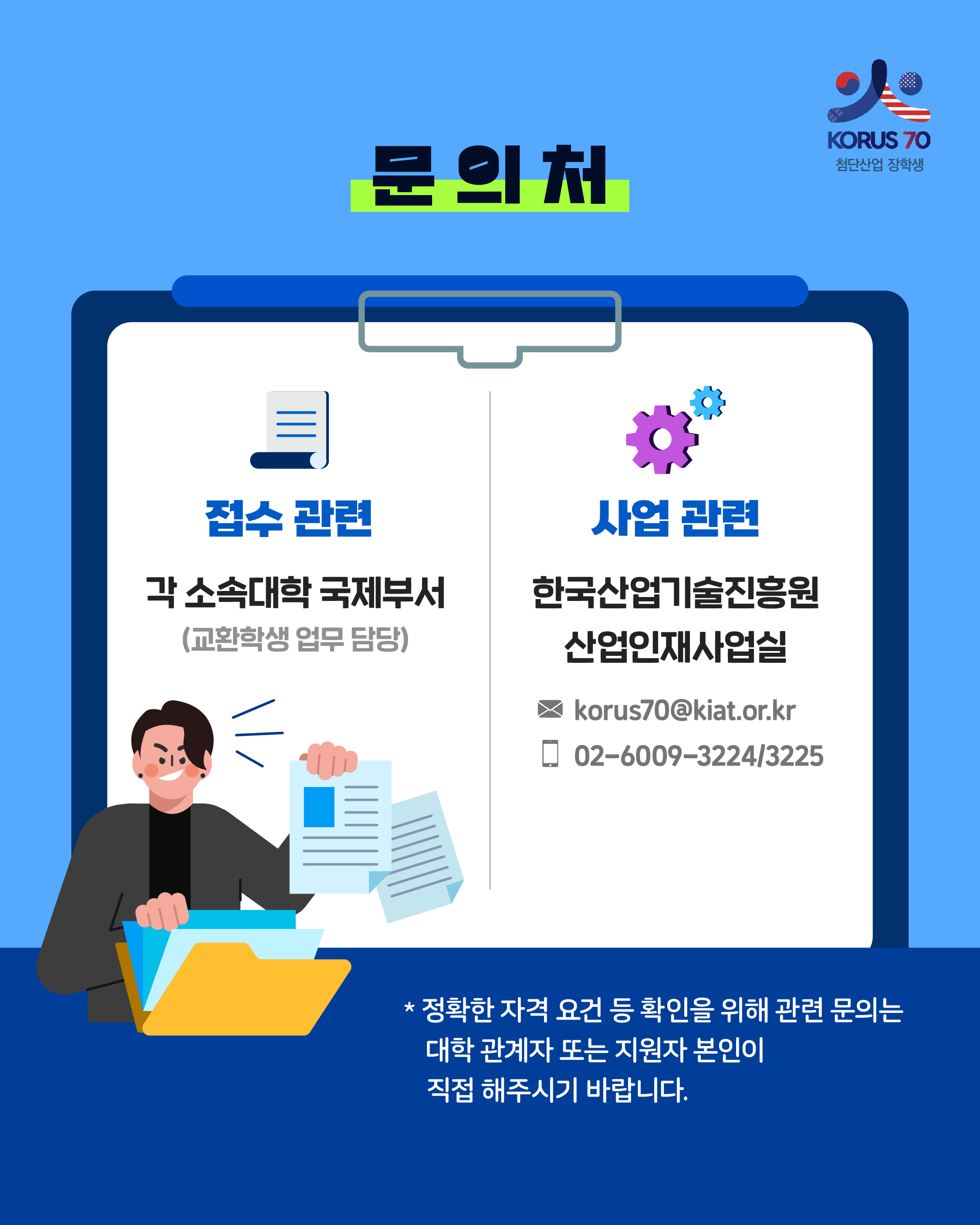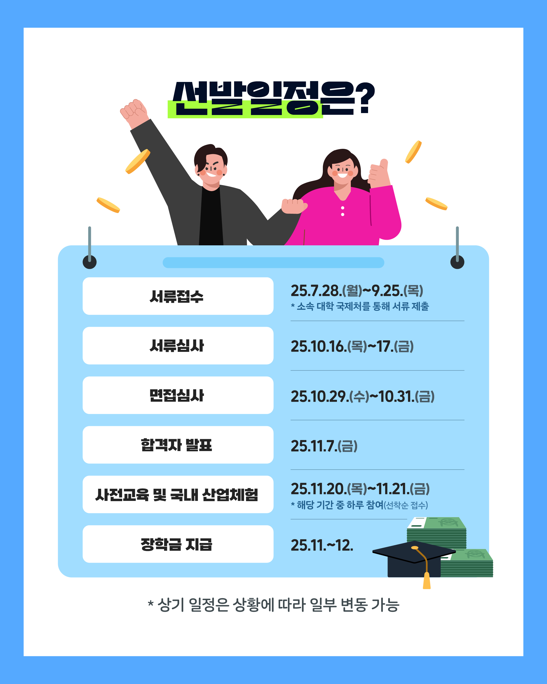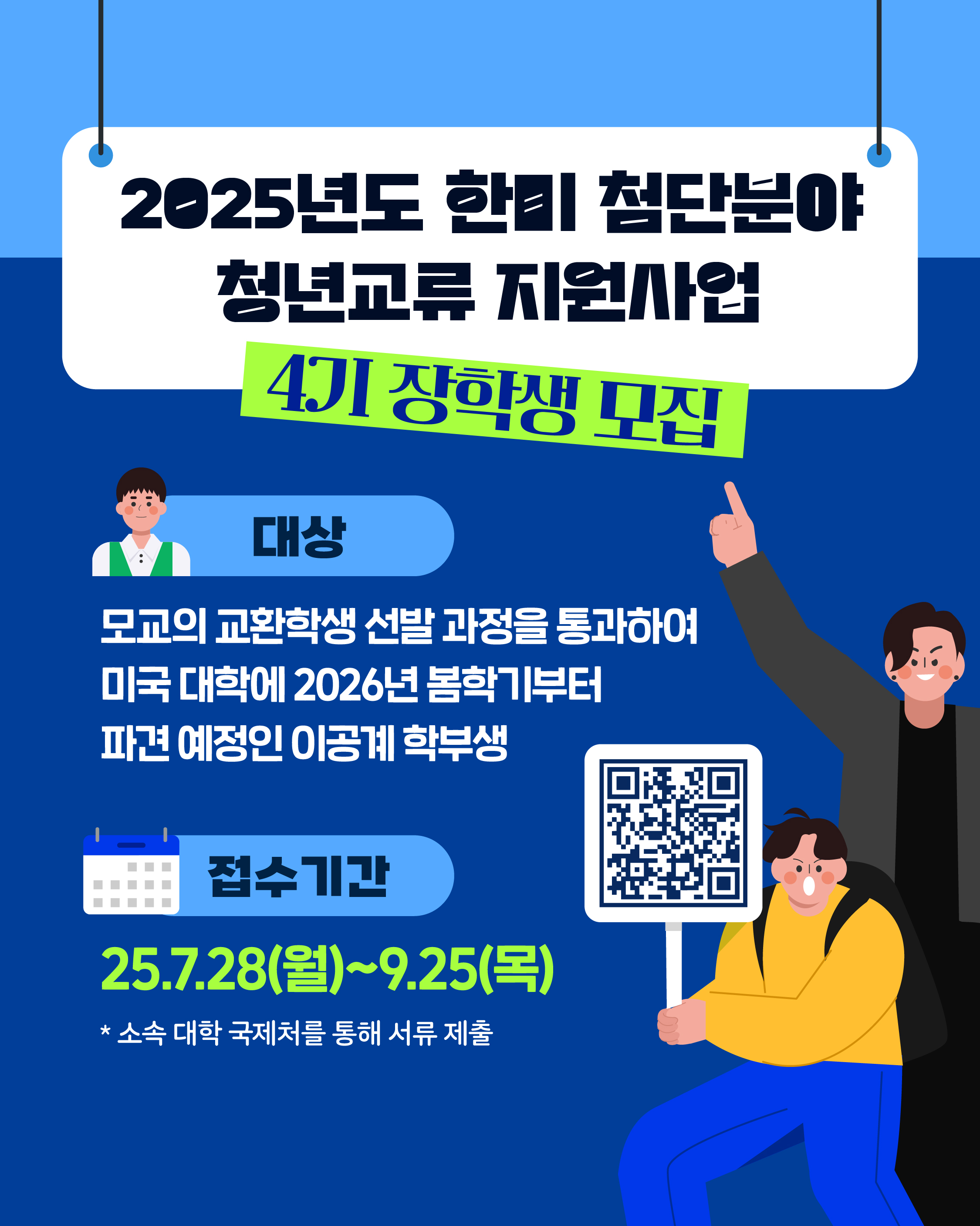 산업통상자원부에서 진행하는 2025년도 한미 첨단분야 청년교류 지원사업 4기 장학생 선발 공고와 관련하여 아래와 같이 안내드립니다.