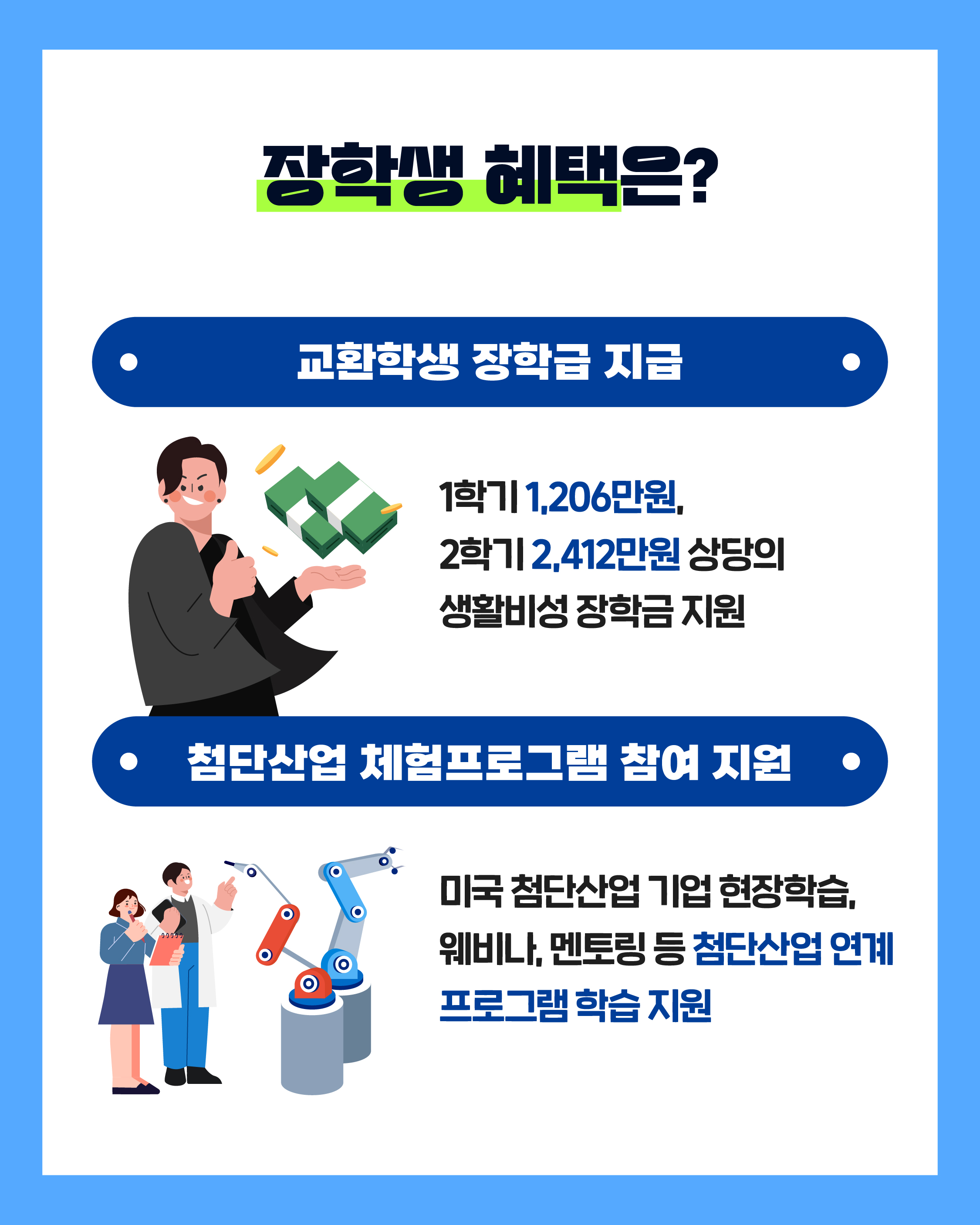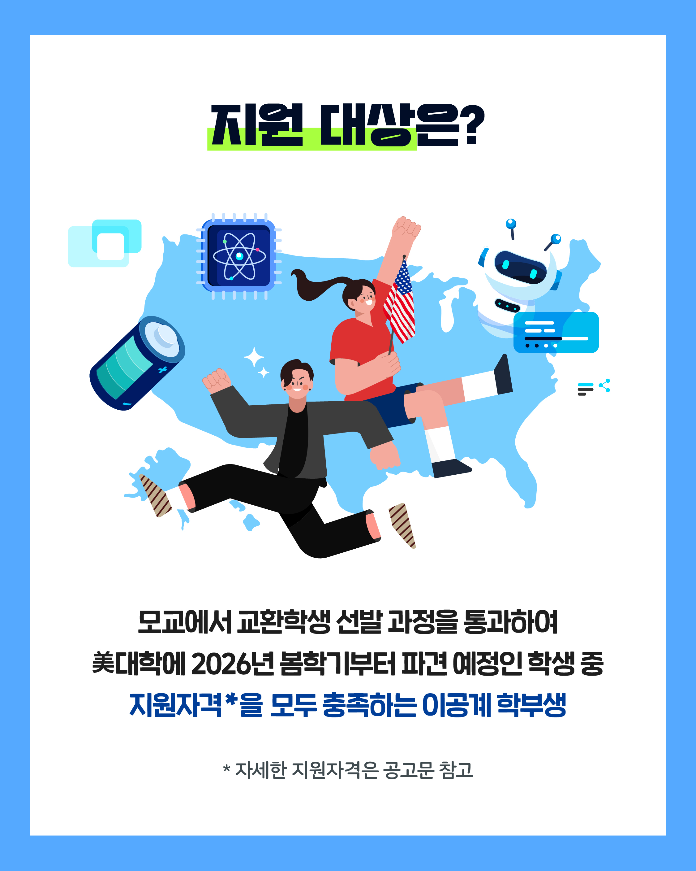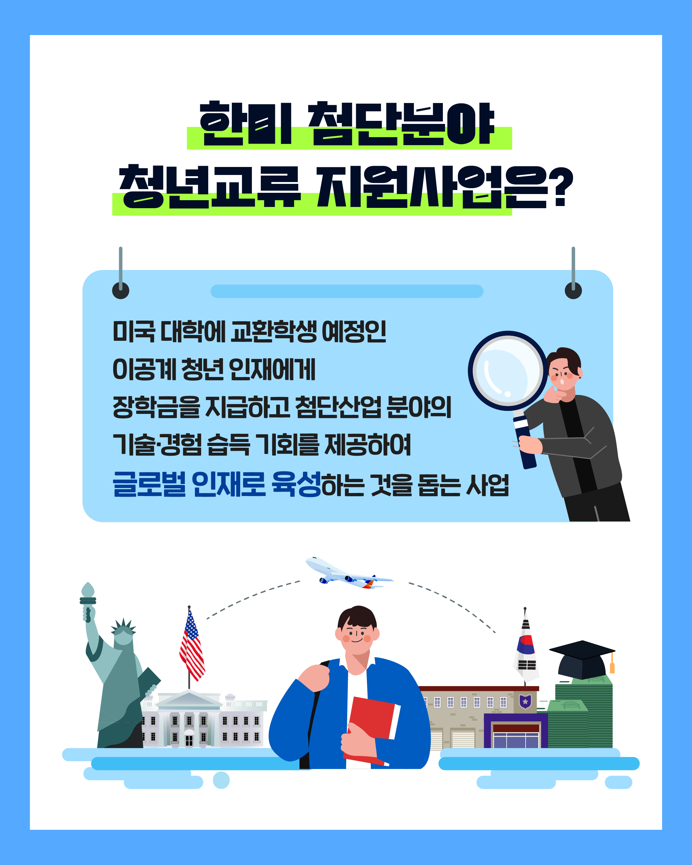 미국 첨단산업 분야의 기술과 경험 습득 기회를 제공하고, 글로벌 인재를 육성하기 위해 미국 대학에 교환학생으로 파견 예정인 이공계 청년인재 모집