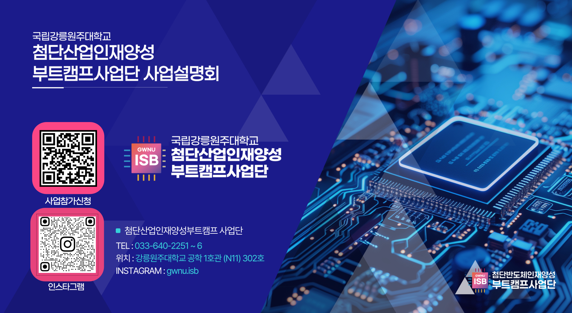 국립강릉원주대학교 첨단산업인재양성부트캠프사업단에서는 해당 사업 참여 학생을 모집하고자「2025년 2학기 첨단산업인재양성부트캠프 사업설명회」를 개최하오니 많은 관심과 참여 바랍니다.