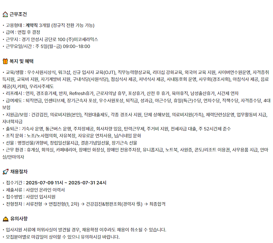 - 지원링크 : https://www.saramin.co.kr/zf_user/jobs/relay/view?isMypage=no&rec_idx=51250757&recommend_ids=eJxVjrsVAyAMxKZJf%2Be%2F6wzC%2FluER4FJKTiEnESryCrik1%2BnQjN9NeSgtFBt3%2FIgVdX9IipbYjA8Si%2BqsoJXNbhsH1gXxW3cu6ISM7945tu%2Bu4STUgGfzyTpTxmtAYwbVpEzLoPK8zZpg7BuecxF9fjHt5rVp%2BoHH3lHIw%3D%3D&view_type=list&gz=1&t_ref_content=ing_recruit&t_ref=company_info_view&relayNonce=031955eec1749dc5ce46&immediately_apply_layer_open=n#seq=0