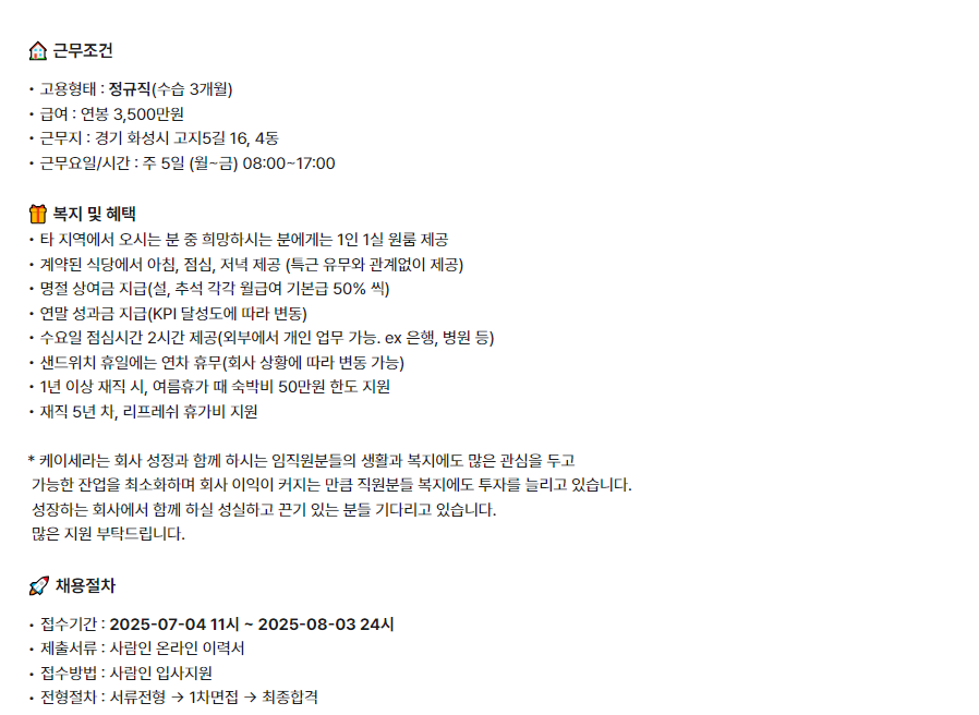 - 지원링크: https://www.saramin.co.kr/zf_user/jobs/relay/view?isMypage=no&rec_idx=51210055&recommend_ids=eJxtj7sNAzEMQ6dJL5L6WHUGuf23iAMn9hUnqHkgRVABdpvhGsCr3mEtqPhHYETEQRY9v%2BZaaoKprdocHxNtmYG22mbONW4UMkc84OXLLlOMm16Z53rKdQtjE%2FKjSoqdbY1IP0Vm0tB5gur58gP%2BisiQtyKEkedaQfd4wMs%2F%2B%2BtLLA%3D%3D&view_type=list&gz=1&t_ref_content=ing_recruit&t_ref=company_info_view&relayNonce=76dfeb6059fb2f50c403&immediately_apply_layer_open=n#seq=0
