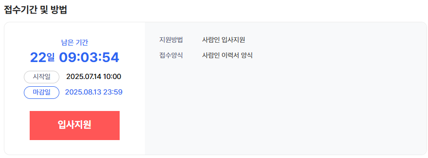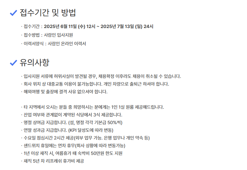 - 지원 링크: https://www.saramin.co.kr/zf_user/jobs/relay/view?isMypage=no&rec_idx=51287121&recommend_ids=eJxtzrERwzAMQ9Fp0hMgQYp1BvH%2BW0RnJ5KKlE%2Fgnb6ASPS4BvCqt8AmPCbrJoYkrhUJpi86KpP7uFjdB609D1bnQXeXFh1ZaV9GD1BxZMxIr0W6ucaPxgjSFuGz78gwUvtfBiyPdTYl9qpu8Q%2BveDJlVffDB57MQ%2BM%3D&view_type=list&gz=1&t_ref_content=ing_recruit&t_ref=company_info_view&relayNonce=ad6e1f2abee4f2d1dbd1&immediately_apply_layer_open=n#seq=0